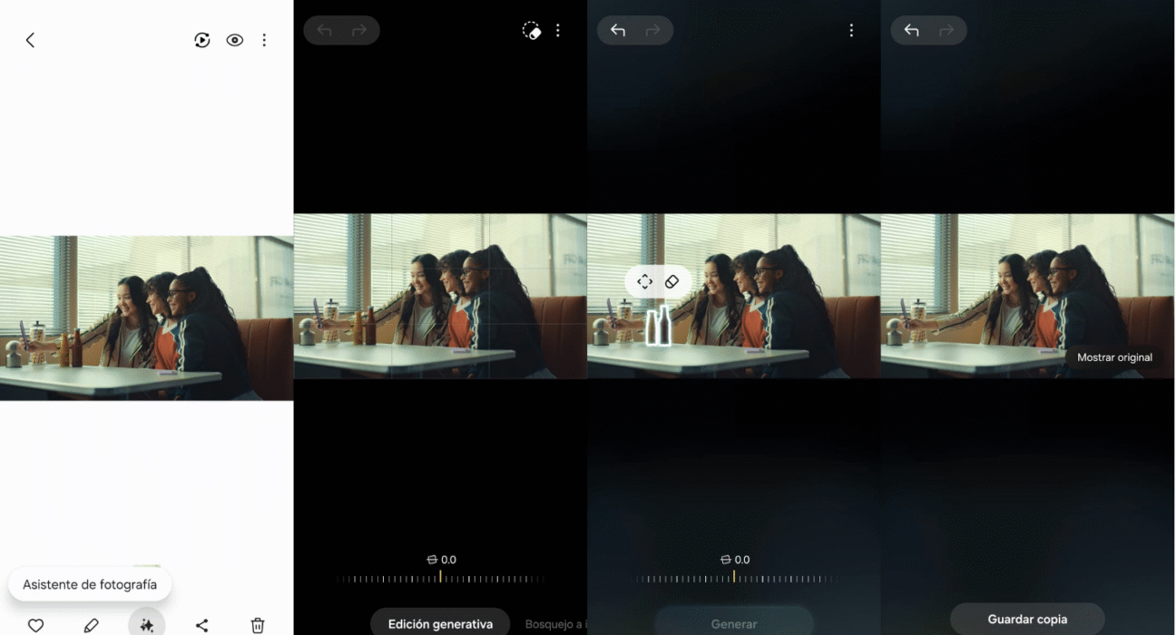 3. Ajusta, genera la nueva imagen y guárdala: Después de seleccionar el objeto, puedes redimensionarlo, moverlo (manteniéndolo presionado) o incluso eliminarlo. Si quieres enderezar la imagen, utiliza el indicador de inclinación. Cuando estés satisfecho, toca en «Generar» para que Galaxy AI procese y recree la imagen de la forma más natural posible. Finalmente, haz clic en «Guardar copia» para guardar la nueva versión como una copia, conservando la original.