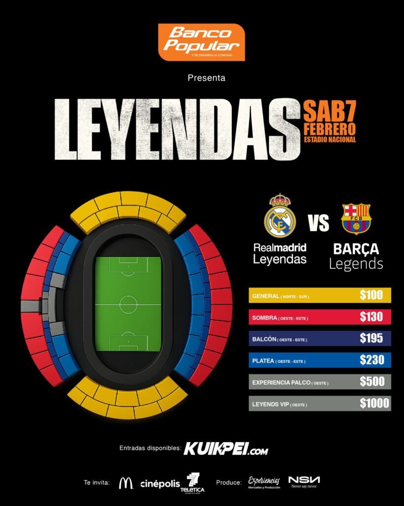 Los precios regulares del evento son: Sol Norte y Sur $100, Sombra Este y Oeste $130, Balcón Este y Oeste $195 y Platea Este y Oeste $230, a los cuales se les aplicará el descuento en las localidades seleccionadas. Además, está disponible la opción de compra con Tasa Cero con tarjeta Monge Pay y Tasa Cero BAC.