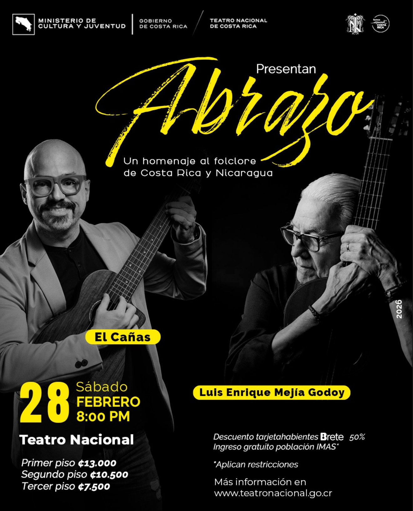 El próximo sábado 28 de febrero, la Sala Principal del Teatro Nacional de Costa Rica recibirá ABRAZO, un encuentro musical de alto valor cultural que reúne a dos referentes de la canción centroamericana: el icónico cantautor nicaragüense Luis Enrique Mejía Godoy y el joven cantautor costarricense El Cañas.